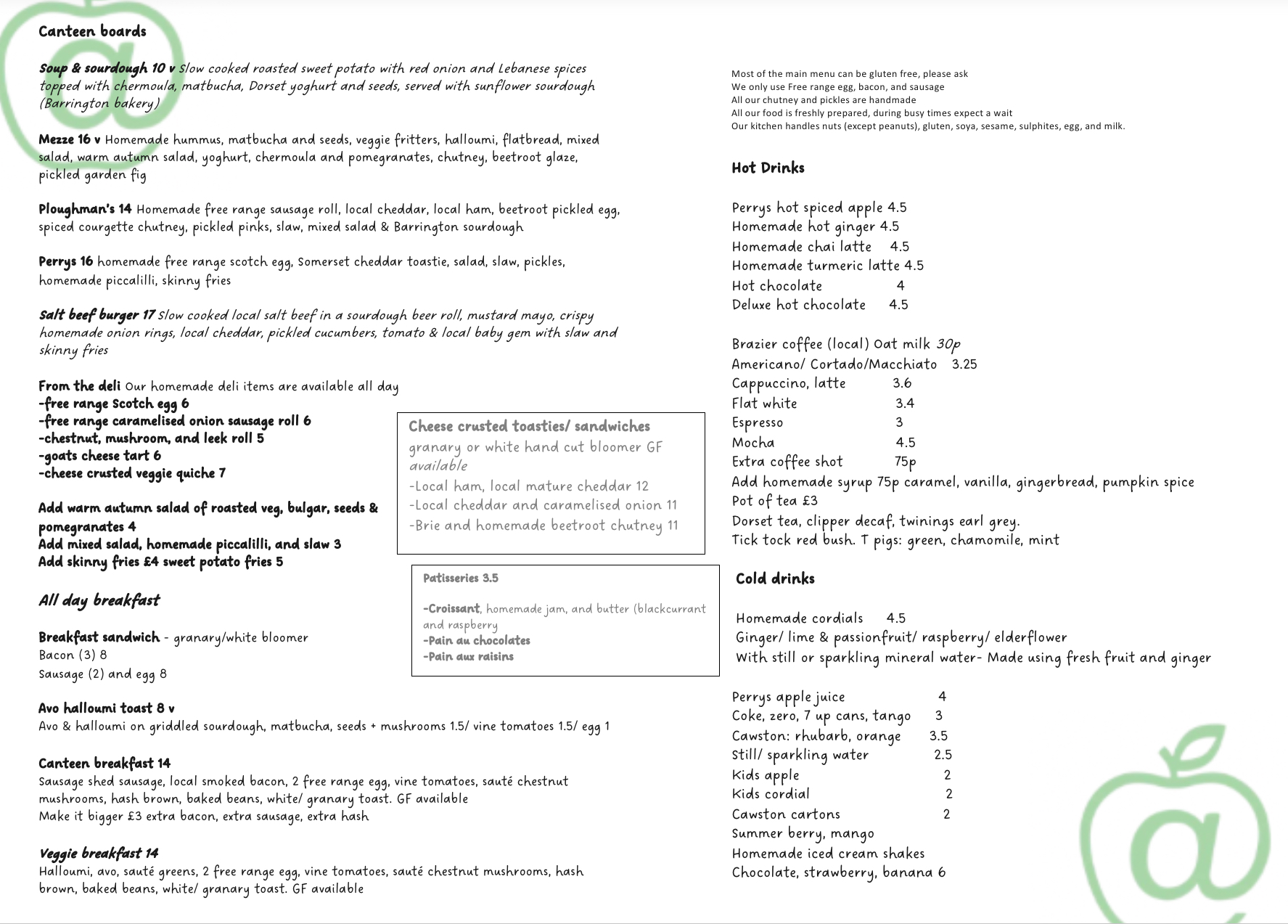 Canteen at Perrys is a unique cafe that combines the best of a coffee shop and a restaurant. We offer a full menu of delicious breakfast, lunch, and homemade cakes, as well as a wide selection of coffee, tea and other homemade drinks. Whether you're looking for a quick bite or a relaxing meal, we have something for everyone.